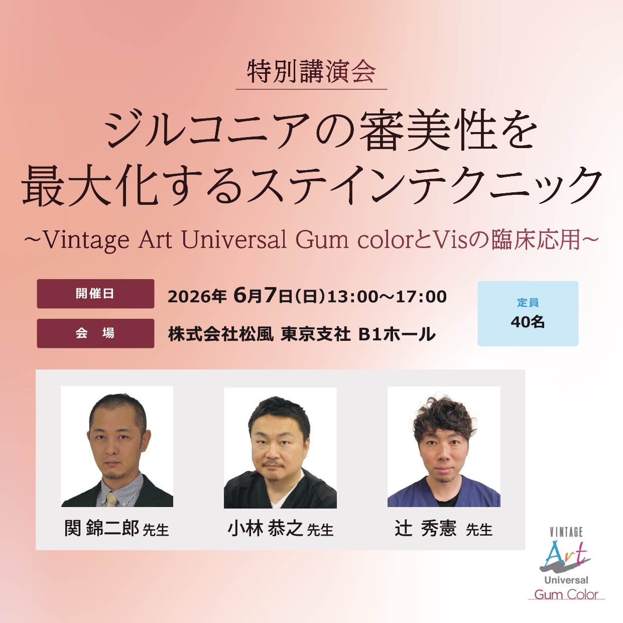 Vintage Art Universal の特別講演会となります! 3名の先生方にVintage Art Universal の開発秘話やコンセプト、歯冠色・歯肉色の色調再現のポイントや「Vis」の応用テクニックについて解説いただきます! |
